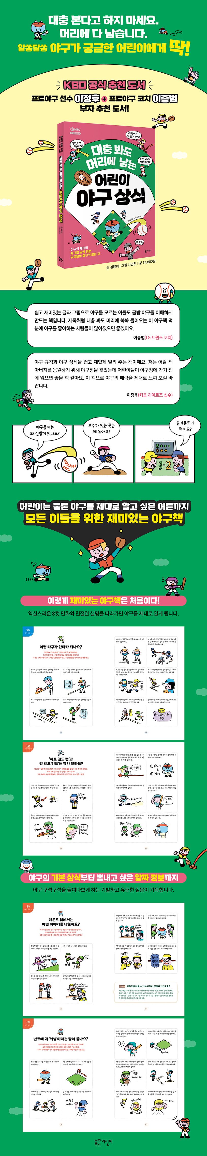 어린이는 물론 야구를 제대로 알고 싶은 어른까지, 모든 이들을 위한 재미있는 야구책이 나왔습니다. 익살스러운 8컷 만화와 친절한 설명을 따라가면 금방 야구를 이해하게 됩니다. 단순히 야구 상식을 쉬운 말로 설명하는 책이 아니라 알쏭달쏭 궁금한 것에 관한 질문에 쉽고 재미있게 답해주지요. ‘야구는 언제 시작되었나요?’, ‘야구는 왜 9회까지 하나요?’와 같은 기본 정보에서부터 ‘홈 플레이트는 왜 오각형일까요?’, ‘타율이 뭐예요?’ 등 야구를 즐기기 위해 꼭 알아야 할 것들은 물론 ‘타자는 언제부터 헬멧을 썼나요?’, ‘유니폼 번호는 언제부터 있었나요?’ 같이 알아 두면 쓸모 있는 야구 상식까지 두루 담았습니다. 김양희 베테랑 야구 전문 기자가 아이들에게 야구를 재미있게 알려 주기 위해 직접 질문을 뽑고, 인기 일러스트레이터 나인완 작가가 무릎을 탁 치게 하는 재치 있는 그림으로 이해를 돕습니다. 제목처럼 대충 보다 보면 야구 상식이 머리에 쏙쏙 남을 거예요.