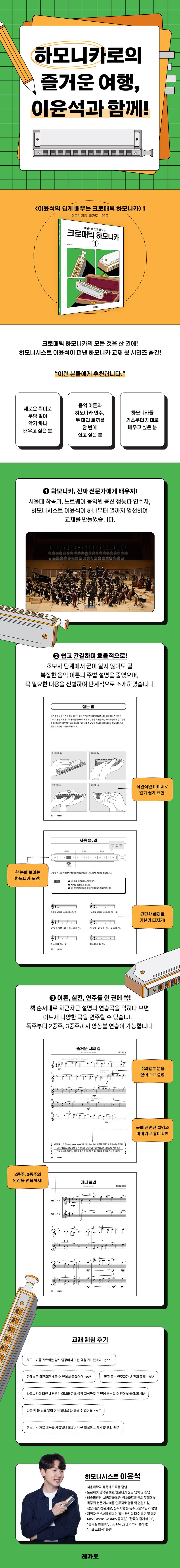 서울대 작곡과, 노르웨이 음악원 출신 정통파 연주자, 하모니시스트 이윤석이 하나부터 열까지 엄선하여 교재를 만들었습니다.