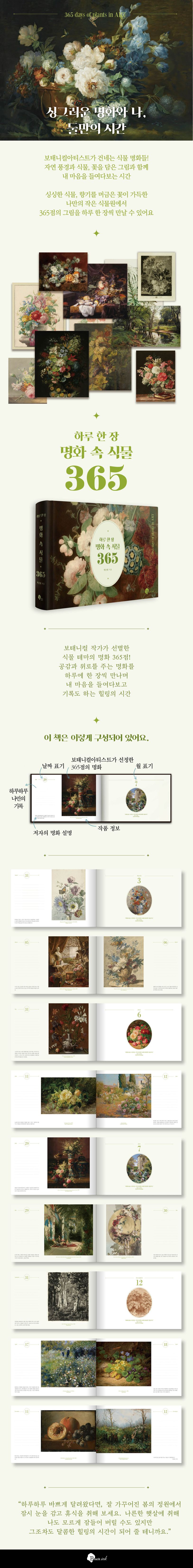 이 책은 보태니컬아티스트인 저자가 정성껏 선별한 365점의 식물 명화를 통해 자신의 마음을 들여다보고 오늘 하루를 직접 기록하기도 하면서, 나만의 작은 식물원에서 힐링의 시간을 보낼 수 있게 도와준다.