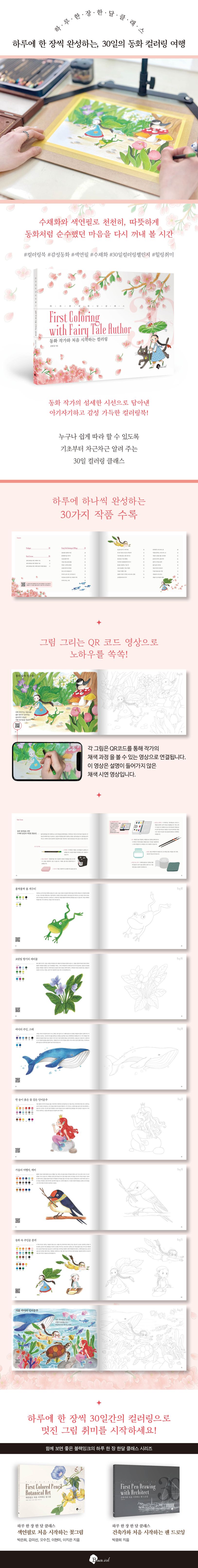 책은 하루에 한 장씩 30일 동안 컬러링을 할 수 있도록 구성되었으며, 각 그림마다 QR코드를 통해 작가의 컬러링 영상을 보고 따라 할 수 있도록 했다. 왼쪽 페이지에 있는 완성 그림을 보며 오른쪽 페이지에 나만의 동화 컬러링을 완성해 보자. 초심자들을 위한 수채화 물감 사용법, 색연필 사용법, 수채화 물감과 색연필을 함께 사용하는 방법 등을 책 앞쪽에 실어 누구나 쉽게 멋진 그림을 완성할 수 있게 도와준다.