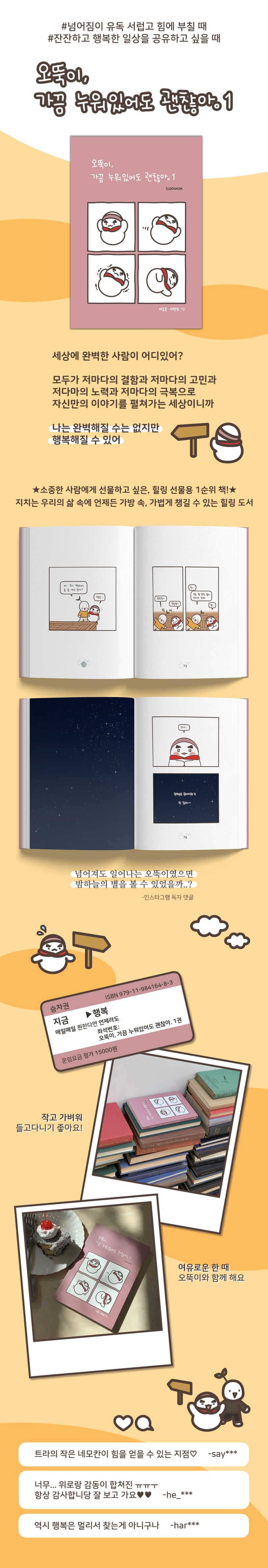 이 책을 읽어보며, 모두 한 걸음 뒤에서 현재의 나를 바라보고 나의 행복과 여유가 무엇인지 찾아보면 좋겠습니다. 다들 넘어지며 행복을 찾을 준비가 되셨을까요? 오뚝이 트라와 새싹이의 겨울과 봄 이야기를 보며 함께 찾아봅시다.