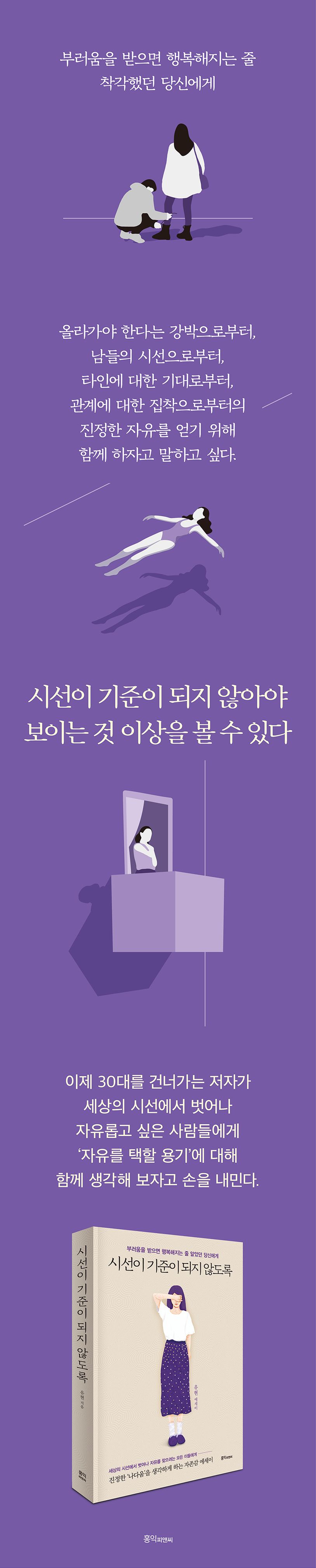 대기업 10년차 직장인인 저자는 이 책에서 항상 보고 싶은 것만 보고 늘 자신의 기준에만 기대어 살아온 삶을 돌아보며, 시선이 기준이 되지 않아야 보이는 것 이상의 세상을 보게 된다는 걸 깨닫게 된 사연을 전한다. 동시대를 살아가는 여성들에게 습관성 편향성에서 벗어나 ‘시선의 자유’를 누릴 용기를 선물하는 책이다.
