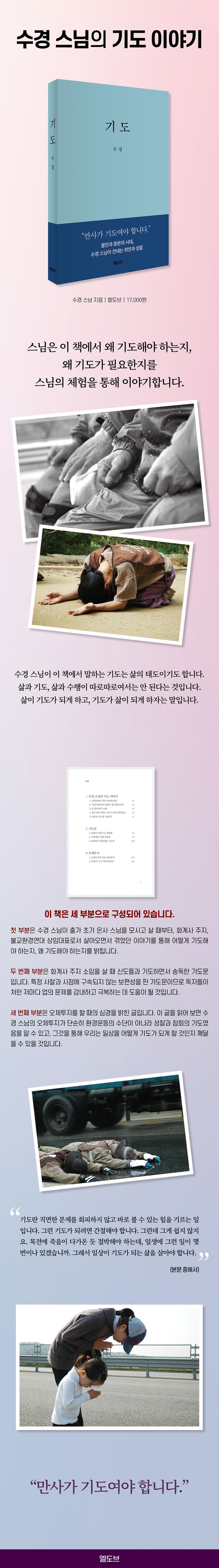 수경 스님이 이번에는 작은 책을 통해 우리에게 왜 기도해야 하는지, 왜 기도가 필요한지를 이야기한다. 이 이야기들은 스님의 체험을 통해 나온 이야기들로 강한 주장이나 논리로 설득하려는 내용 없이도 우리의 공감을 자아낸다. 체험 없이는 나올 수 없는 이야기의 힘이다. 이 책은 '기도에 관한 스님의 체험 이야기'와 '화계사 주지로 있을 때 신도들과 기도하며 송독한 기도문', '오체투지를 할 때의 심경을 밝힌 글' 이렇게 크게 세 부분으로 이루어져 있다.