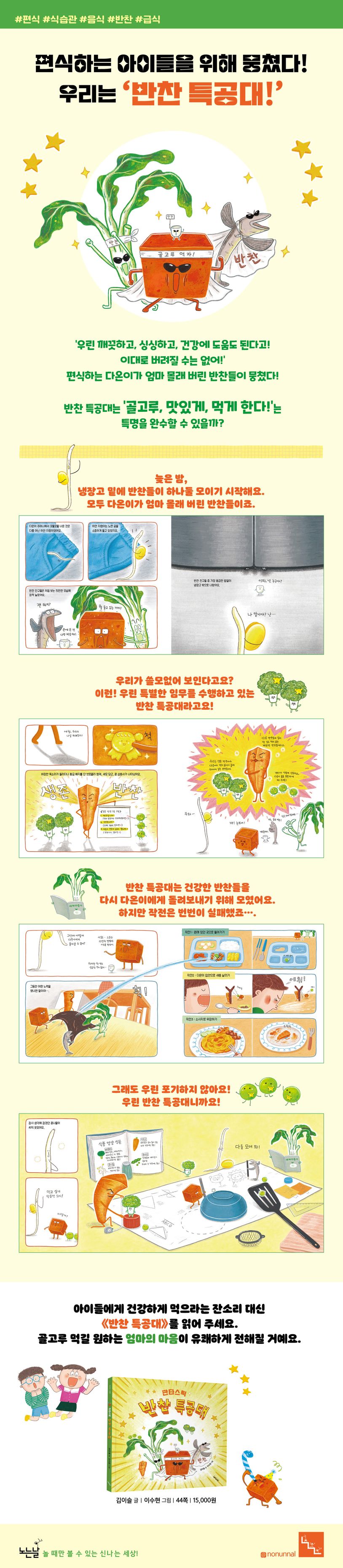 다온이가 엄마 몰래 버린 반찬들이 늦은 밤 냉장고 밑에 모였어요. 잇자국이 난 깍두기, 반으로 잘린 밥알, 시든 시금치, 먼지가 묻은 멸치가 그 주인공이죠. 더러워진 반찬들은 쓸모없다고요? 천만에 말씀! 반찬들은 멋진 작전을 수행하고 있는 ‘반찬 특공대!’랍니다.