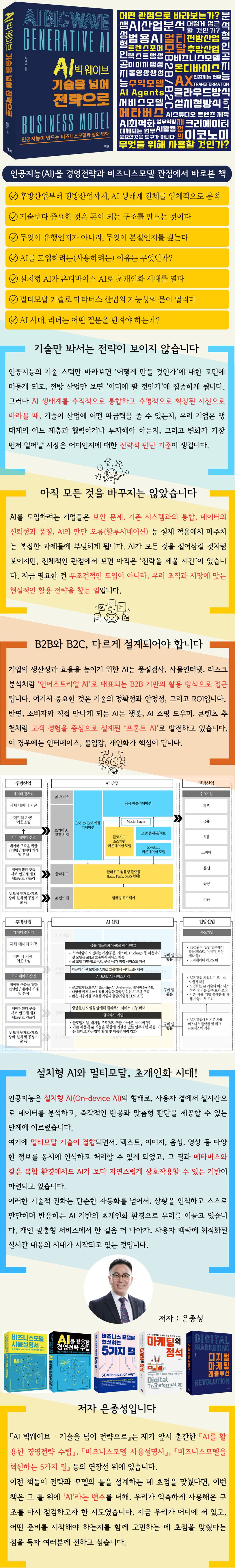 생성형 AI, AI 에이전트, 온디바이스 AI… 매일같이 쏟아지는 뉴스 속에서 우리는 마치 변화의 물결 위에 올라탄 것 같지만, 정작 중요한 질문은 여전히 공중에 떠 있습니다. "이 기술이 우리에게 어떤 의미인가?" "어떻게 활용해야 진짜 전략이 될 수 있는가?"『AI 빅웨이브 - 기술을 넘어 전략으로』는 이 질문에서 시작합니다. 이 책은 단순히 AI 기술을 설명하는 데 그치지 않습니다. 기술을 이해하는 것도 중요하지만, 그 기술을 바라보는 '관점'이 전략의 시작점이라는 통찰을 던집니다. 같은 기술이라도 어떻게 바라보느냐에 따라 전혀 다른 결과를 만들 수 있기 때문입니다.책의 중심에는 일관된 메시지가 흐릅니다. AI는 기술이 아니라 전략이다. 단순한 도입보다 더 중요한 것은 왜, 어디에, 어떻게 도입할지를 조직과 개인이 스스로 묻고 답하는 과정입니다. 업무 자동화를 넘어서, 비즈니스모델을 새롭게 설계하고, 고객과의 접점을 다시 정의하는 데까지-AI는 이제 전면적 변화의 기회로 다가오고 있습니다.흥미로운 점은 이 책이 ‘AI 기술’이 아니라 AI를 둘러싼 생태계 전체를 조망한다는 점입니다. 반도체, 클라우드, 데이터 인프라, 알고리즘, 스타트업의 서비스모델까지-AI는 혼자 움직이지 않습니다. 저자는 후방산업과 전방산업의 흐름을 짚으며, 기술이 어디에서 시작되어 어디로 확산되고 있는지를 차분히 보여줍니다. 이는 단순히 기회를 예측하는 능력을 넘어, ‘기회를 설계하는 힘’을 독자에게 전해줍니다.책 후반으로 갈수록 더욱 구체적인 적용 사례들이 흥미를 끕니다. 기업들이 수익 모델로 이어가지 못하는 이유, AI 에이전트를 둘러싼 생태계의 구조, 메타버스와 생성형 AI의 결합이 열어가는 새로운 시장 가능성 등-단편적인 정보가 아니라, 비즈니스 전략과 산업 분석이 연결되는 사고의 프레임을 제공해줍니다.무엇보다 인상적인 부분은 AI를 '인간의 대체자'가 아닌 '확장자'로 바라보는 시선입니다. 기술이 가져오는 효율성보다, 그것을 통해 인간의 창의력과 판단력이 어떻게 확장될 수 있는지를 이야기하는 이 책은, 독자로 하여금 기술에 휘둘리는 것이 아니라, 기술과 함께 성장하는 감각을 일깨워줍니다.『AI 빅웨이브』는 단지 AI를 잘 설명한 책이 아닙니다. AI를 어떻게 ‘생각해야’ 하는지를 알려주는 책입니다. 기술보다 한 발 앞서 움직이는 전략적 사고, 산업 흐름을 꿰뚫는 통찰, 그리고 사람의 역할에 대한 진지한 고민까지-지금 우리가 AI 시대를 준비하며 가져야 할 모든 질문이 이 책에 담겨 있습니다.