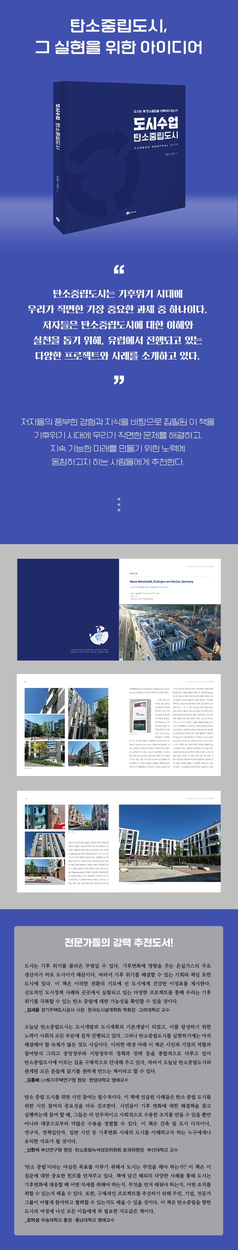 탄소 중립 도시에 대한 폭 넓고 깊이 있는 이해를 위해, 저자들이 축적해 온 연구결과와 지식을 바탕으로 선별한 11개 프로젝트 사례를 직접 방문하여 현장조사, 촬영, 인터뷰를 진행하였고, 관련 자료와 문헌 분석 등을 토대로 〈도시수업 : 탄소중립도시〉를 출판하게 되었다. 이 책이 우리의 도시가 기후변화에 맞서 체계적으로 변화와 전환을 준비하고 탄소 중립 도시를 향해 나아가는 여정에 조금이나마 기여하기를 희망한다.