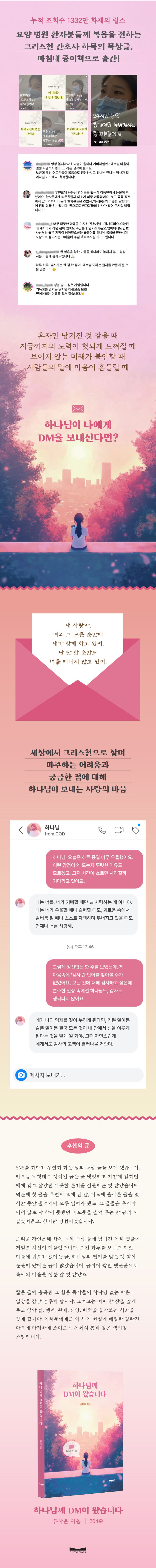 〈하나님께 DM이 왔습니다〉는 인스타그램에 카드뉴스 형식으로 업로드되는 류하은 작가의 묵상글을 엮어 한 권의 책으로 만들었다. 특별히 인스타그램 콘텐츠에는 없는 누구나 한 번쯤 해봤을 고민과 궁금한 점들을 하나님께 드리는 기도 형식으로 담아 공감할 지점을 더했다. 한치 앞도 보이지 않는 오늘을 상처와 불안을 안고 살아가는 청년들에게 하나님의 마음을 담은 편지를 통해 사랑과 위로가 닿기를 소망한다.
