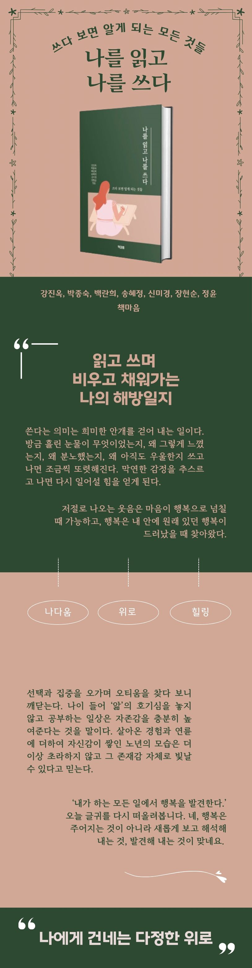 읽고쓰며비우고채워가는나의해방일지어른으로살아가려면매일철학과거래하면서살아야한다.쉽지않지만,성장을멈추고싶지는않다.어른의공부는내고집만우기지않고,설득당할수도있음을배우는것이다.<작가입문>중에서성장을위해마음을비우는시간.나를읽고,쓰는과정을통해과거를리셋(reset)하기로했다.‘넌아프지않아.네마음을말과글로표현할수있다는건건강하다는거야.’<성장을위해마음을비우는시간,리셋>중에서타인의기준에흔들리지않고내기준으로생각하고행동하며,그들과나의부를비교하지않는내면의굳건함이필요하다.소유하고비교하는욕망으로부터자유로울만큼평안한내면구축을위한책읽기는내게필수임을다시한번자각한다.<비교심리>중에