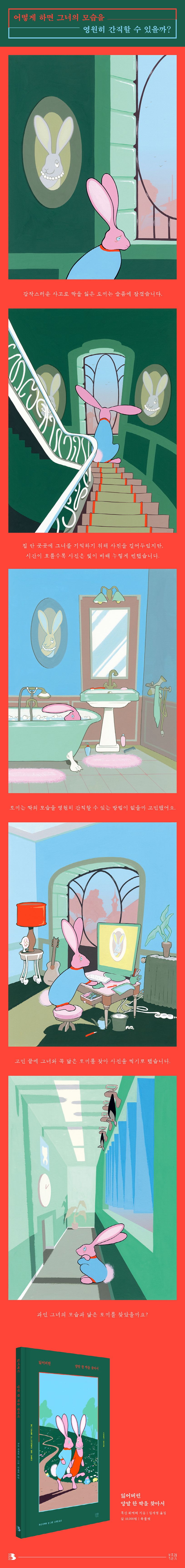 어느 날 사고로 암컷 토끼를 잃은 수컷 토끼는 어떤 말로도 표현할 수 없는 깊은 슬픔에 잠깁니다. 잃어버린 짝을 기억하기 위해 토끼는 그녀의 모습을 담은 사진을 집 안 곳곳에 걸어두었지만, 시간이 흐를수록 빛이 바래져가는 모습에 더욱더 큰 슬픔에 잠기는데요. 그는 그녀의 모습을 영원히 간직하고 싶은 마음에 아이디어를 하나 떠올립니다. 그는 과연 잃어버린 그녀를 영원히 간직할 수 있는 방법을 찾았을까요?