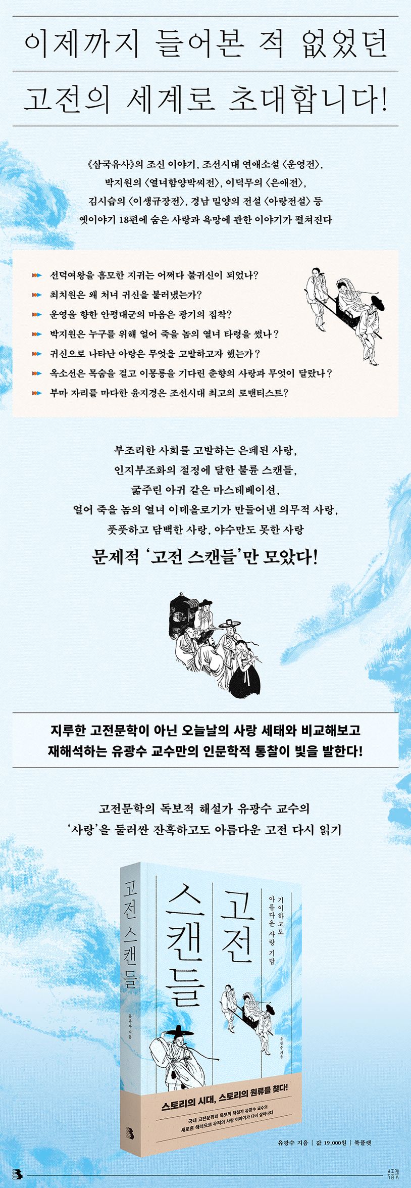 고전문학의 독보적 해설가 유광수 교수의 《고전 스캔들》에는 선덕여왕을 흠모한 이유로 불귀신이 되어버린 역졸의 사연, 통일신라 때 유명세를 톡톡히 치렀던 최치원을 둘러싼 해괴한 이야기, 경남 밀양부사의 딸 아랑의 죽음에 얽힌 전설, 가문의 출세를 위해 강요당한 희생 ‘열녀 이데올로기’의 문제 등 잘못된 당시의 사랑과 여성의 지위, 사회적 문제를 가늠해볼 수 있는 잔혹하고도 아름다운 사랑 기담을 담았다. 저자는 고전에 꼬리표처럼 따라 붙는 권선징악이라는 주제로 귀결되는 천편일률적인 해석이 아닌 인간의 본성과 당시의 시대상에 주목하여 입체적으로 해석해준다. 고전 속 각각의 인물이 갖는 특징과 당시의 시대상을 함께 살펴보는 저자의 해석을 따라 가다 보면 단순히 옛이야기에 그치지 않고 오늘의 우리를 비춰보는 거울로 삼기에 충분하다.