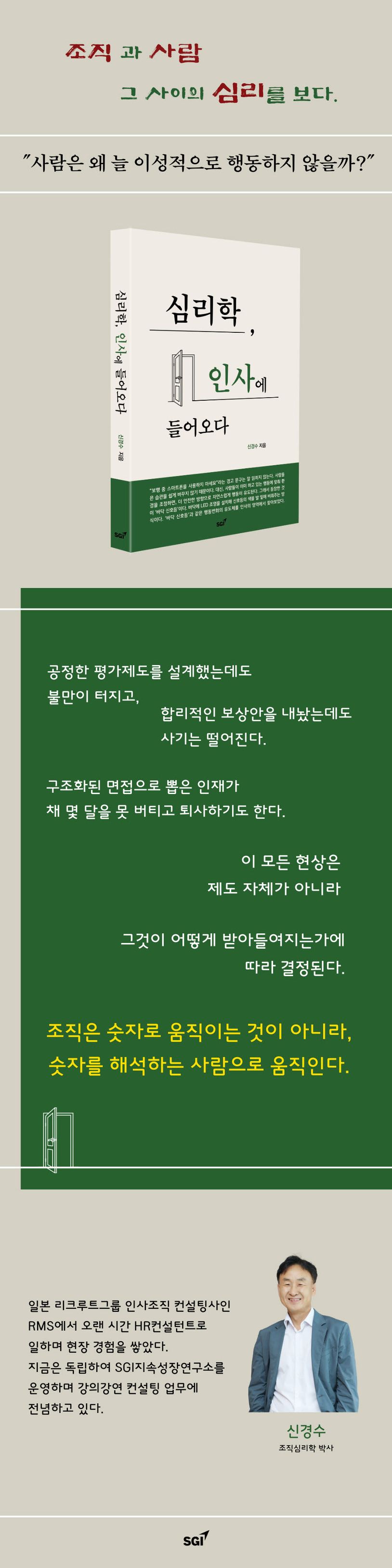 이 책은 그런 질문에서 출발한다. 인사는 점점 더 과학화 되어 가고, 경영은 데이터 기반의 의사결정을 요구받고 있다. 하지만 조직에서 일어나는 문제의 대부분은 숫자가 아닌 심리의 세계에서 발생하고 있다. 왜일까? 이유는 간단하다. 조직은 사람으로 구성되고, 사람은 이성뿐 아니라 감정과 인지 편향으로 움직이는 감각적 동물이기 때문이다.