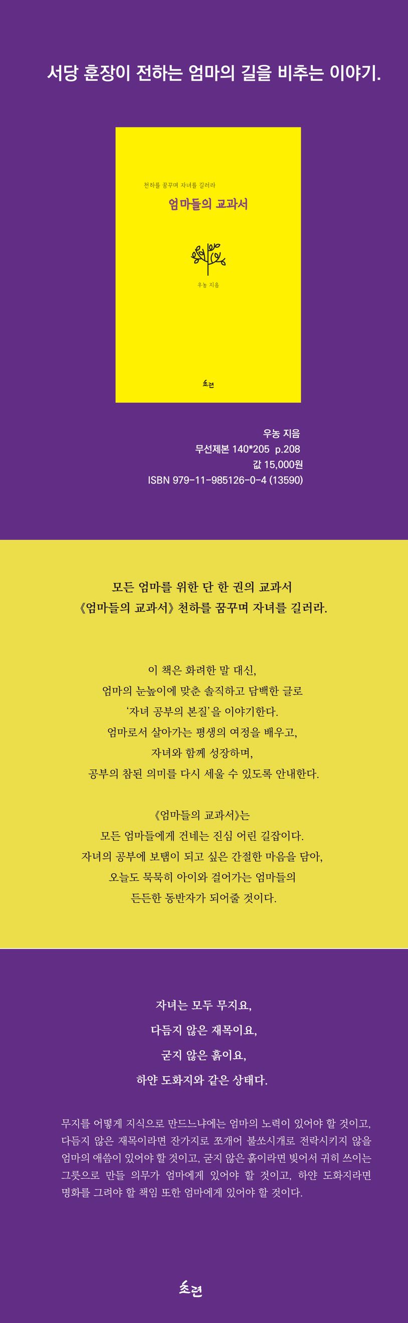이 책은 화려한 말 대신, 엄마의 눈높이에 맞춘 솔직하고 담백한 글로 ‘자녀 공부의 본질’을 이야기한다. 엄마로서 살아가는 평생의 여정을 배우고, 자녀와 함께 성장하며, 공부의 참된 의미를 다시 세울 수 있도록 안내한다.