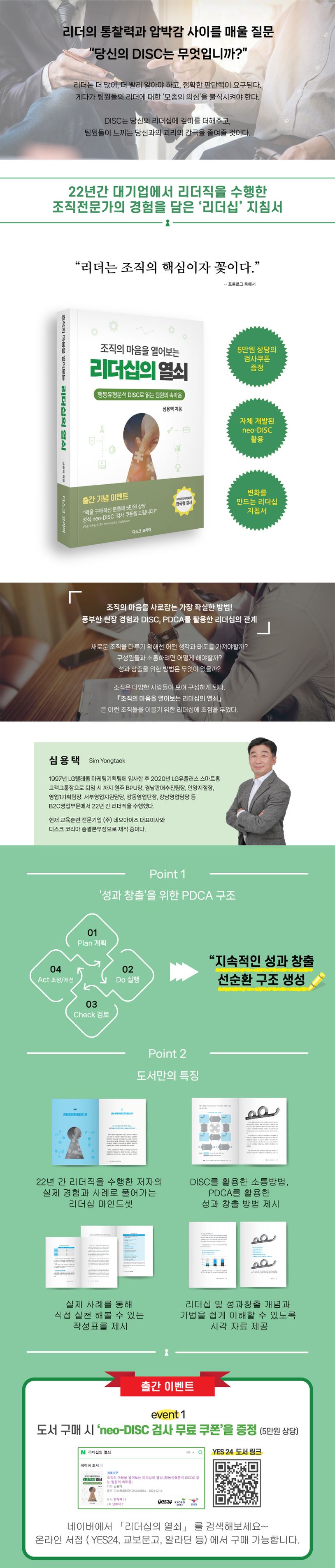 독자들 이 이해하기 쉽도록 설명하고 DISC와 PDCA를 활용한 방법들을 제시한다. ‘새내기 리더’들과 리더를 꿈꾸는 ‘도전자’들 중 이 책에서 얻은 지식을 활용한다면 변화와 성장의 첫걸음을 내디딜 수 있도록 안내해 주는 등대가 되어줄 것이다.