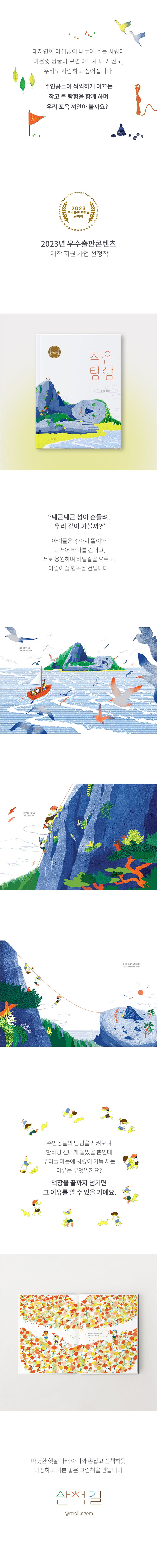 『작은 탐험』은 꼼은영 작가의 두 번째 창작 그림책입니다. 주인공 아이들은 반려견 똘이와 노 저어 바다를 건너고, 서로 응원하며 비탈길을 오르고, 아슬아슬 협곡을 건넙니다. 조약돌을 조심조심 쌓고, 사락사락 수풀 사이를 걷고 꽃밭에서 노래합니다. 이들의 탐험을 지켜보며 한바탕 신나게 놀았을 뿐인데 독자들 마음에 사랑이 가득 차는 이유는 무엇일까요? 책장을 끝까지 넘기면 그 이유를 알 수 있습니다. 자연의 아름다움에서 사랑하는 누군가의 모습을 떠올리며 자연과 나의 관계, 가족애를 듬뿍 느낄 수 있는 그림책입니다.