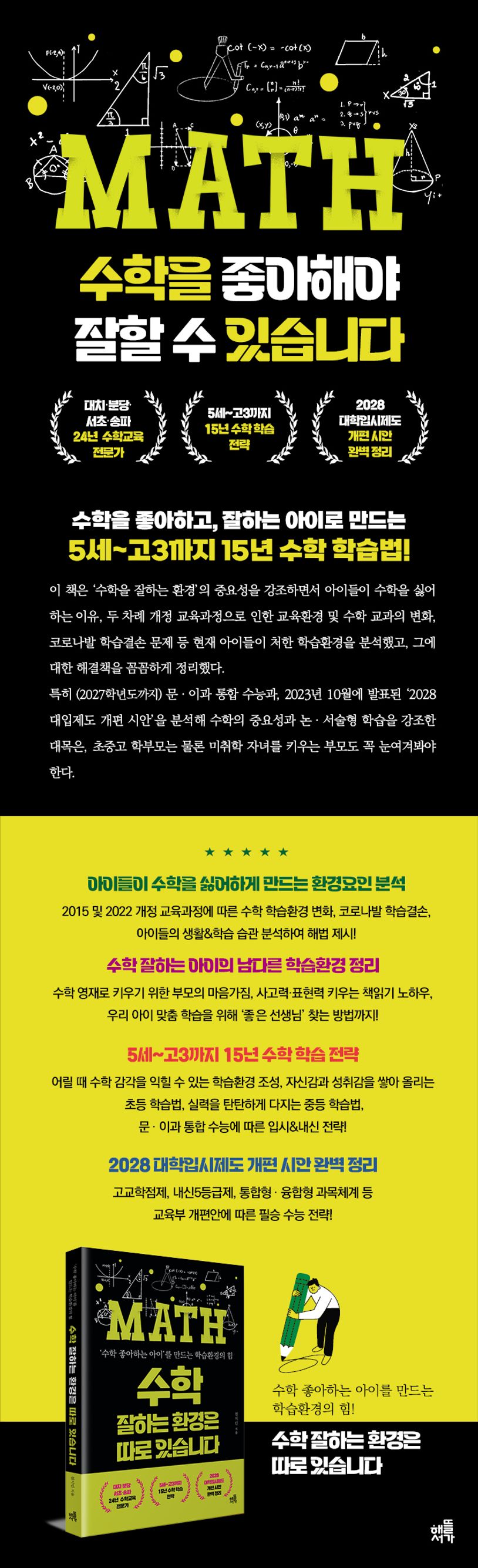 5세~고3까지 15년 수학 학습 로드맵, 지필+수행 시대에 개념·연산·심화·논서술형 학습법과 프로젝트 수업 준비 방법 등 실질적인 노하우를 담았기에 수학 때문에 고민 중인 부모들에게 꼭 필요한 안내서가 될 것입니다.