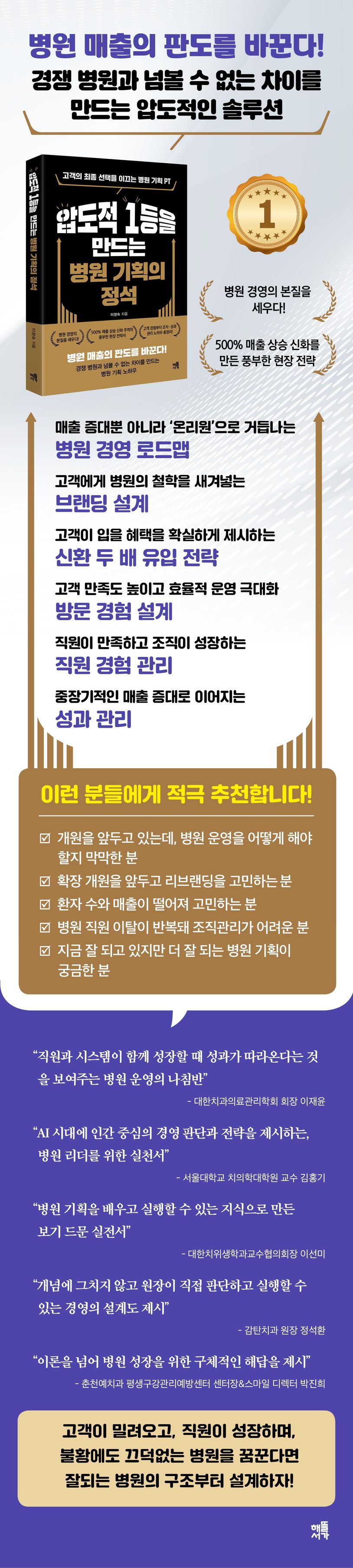 압도적인 1등 병원은 단순히 진료비 수입이 높은 병원이 아니다. 고객에게 선택받는 이유가 분명하고, 직원이 성장하며, 불황에도 흔들리지 않고 매출이 탄탄하게 유지, 향상되는 병원이다. 지금보다 조금 더 단단한 병원, 고객 및 직원과 행복한 동행을 지속하고 싶은 분들에게 이 책을 강력 추천한다.