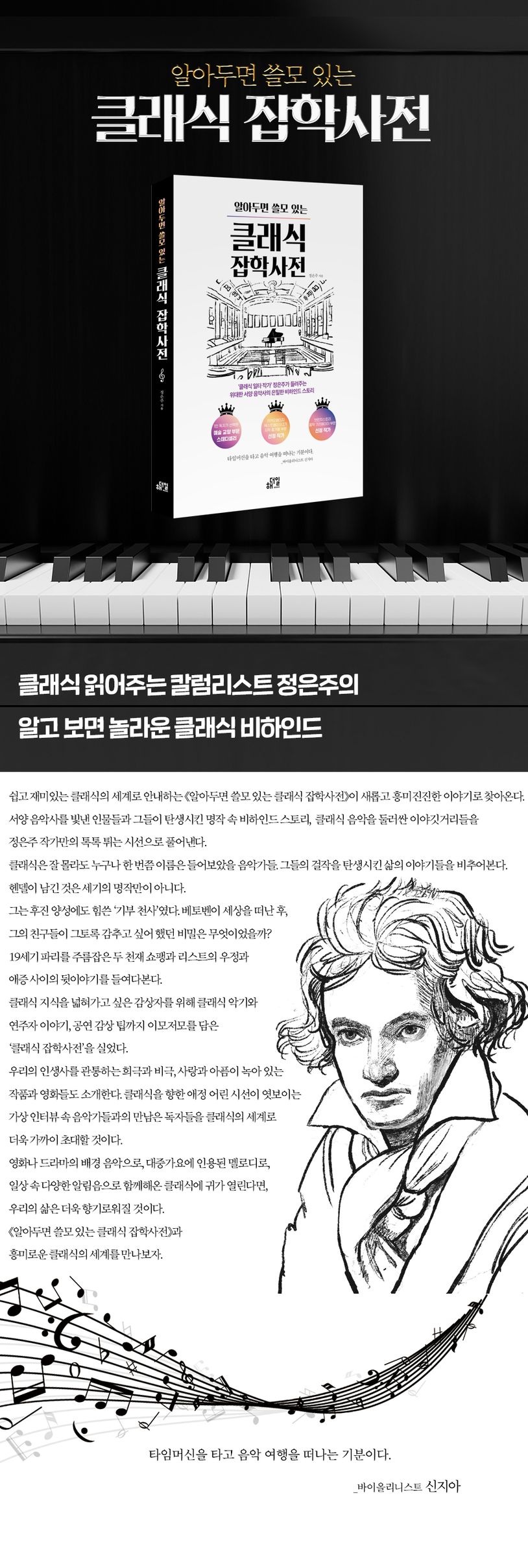 영화나 드라마의 배경 음악으로, 대중가요에 인용된 멜로디로, 일상 속 다양한 알림음으로 함께해온 클래식에 귀가 열린다면, 우리의 삶은 더욱 향기로워질 것이다. 《알아두면 쓸모 있는 클래식 잡학사전》과 흥미로운 클래식의 세계를 만나보자.