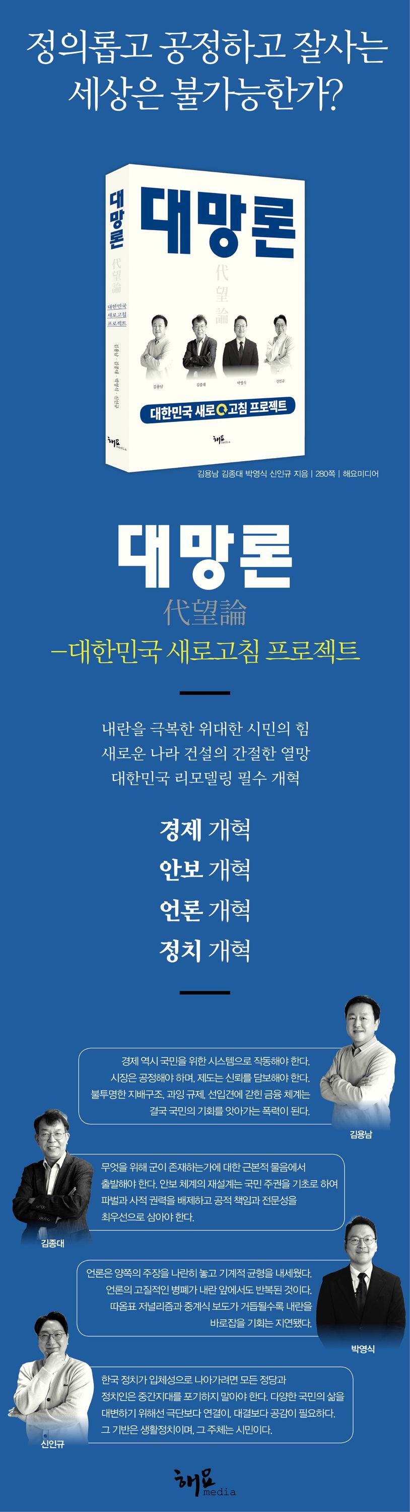 정의롭고 공정하고 잘사는 세상은 불가능한가? 전대미문의 내란 위기를 극복한 대한민국은 움츠러들었던 어깨를 펴고 새 날개를 달 수 있을까? 대한민국을 새롭게 설계하겠다는 열망을 품은 네 명의 지식인이 모였다. 2025년 2~4월 국회에서 ‘대한민국 새로고침 프로젝트’라는 주제의 토론회를 세 차례 진행한 이들은 개혁에 대한 열망과 의지를 확산하고 뜻을 같이하는 많은 시민과 소통하고 연대하기 위해 이 책을 집필했다. 이들이 간절한 마음으로 제시한 경제, 안보, 언론, 정치 네 분야 개혁안이 새 정부의 국정과제에 반영되고, 이 책의 독자가 될 개혁 시민 모두 새 시대의 청사진을 함께 그려나가기를 소망한다.