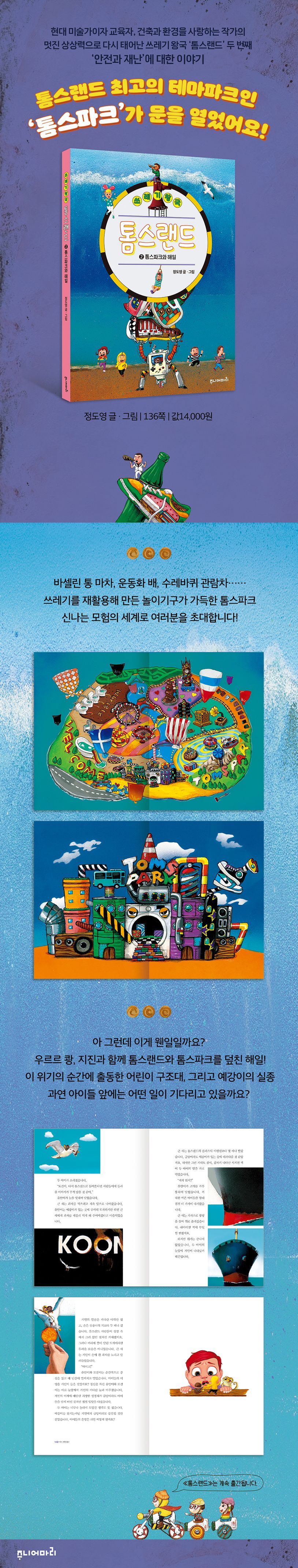 《쓰레기 왕국 톰스랜드》 시리즈는 쓰레기를 재활용하며 새롭게 태어난 작은 섬 톰스랜드를 배경으로 하는, 버려지는 것들에 관한 이야기입니다. 물건은 언젠가는 버려질 수밖에 없습니다. 어떤 물건은 기능을 잃어서, 어떤 물건은 유행이 지나서 버려지지요.
