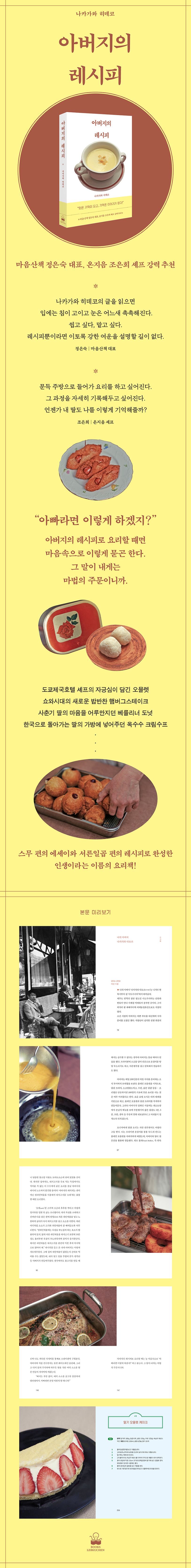 마음만 먹으면 무엇이든 살 수 있고, 손끝만 움직이면 원하는 음식이 문 앞까지 배달되는 시대. 그럼에도 요리교실 ‘구르메 레브쿠헨’을 이끄는 요리 연구가 나카가와 히데코는 오늘도 아버지가 건넨 낡은 레시피 노트를 펼친다. 도쿄제국호텔 프렌치 셰프였던 아버지 ‘나카가와 다모쓰’가 전하는 맛의 비밀, 가족을 향한 다정한 마음, 같은 길을 선택한 딸에게 건내는 조용한 격려… 아버지의 레시피에는 한 사람의 인생이 고스란히 담겨 있다. 저자 나카가와 히데코는 쇼와시대부터 헤이세이시대까지 60년을 요리를 향한 열정 하나로 살아낸 아버지의 인생을 재구성하고, 그 레시피를 한 그릇 한 그릇 정성스럽게 재현하며 스무 편의 이야기와 서른일곱 편의 레시피, 칠십여 컷의 사진으로 소담스럽게 담았다.