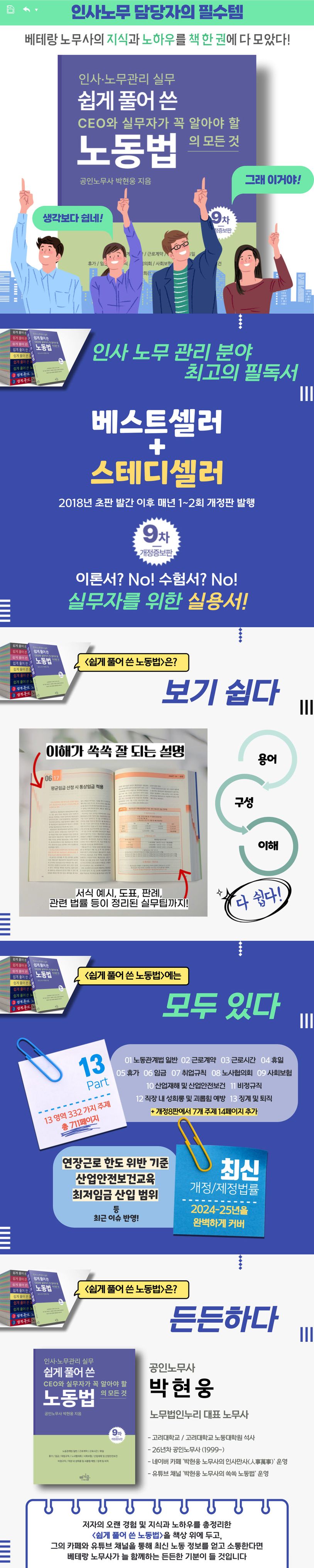 '쉽게 풀어 쓴 노동법'은 CEO와 인사ㆍ노무 실무자들이 꼭 알고 있어야 할 노무지식의 지침서이다. 초판 출간 이후 매년 1-2회 개정판으로 업데이트하여, 실무자들이 최근 개정된 노동법을 놓칠 걱정이 없도록 든든하게 도와주고 있다. 〈노동관계법 일반 / 근로계약 / 근로시간 / 휴일 / 휴가 / 임금 / 취업규칙 / 노사협의회 / 사회보험 / 산업재해 및 산업안전보건 / 비정규직 / 직장 내 성희롱 및 괴롭힘 예방 / 징계 및 퇴직〉 총 13개 분야의 332개 주제로 구성된 이 책은 인사ㆍ노무 관련 주요 업무에 대한 기본 지식뿐 아니라 전문적인 실무처리 방법을 체계적으로 정리하여, 현장에서 발생하는 다양한 주요 사안들을 전문가의 도움 없이도 손쉽게 해결할 수 있도록 도와준다. 또한 딱딱하고 어려울 수 있는 노동법 관련 지식을 도표와 예시로 정리하여 쉽게 이해할 수 있도록 구성하였다. 인사ㆍ노무 관리에 필요한 전반적인 지식을 빠짐없이 다룬 이 책 한 권이면 실무적인 활용에 부족함이 없을 것이다.