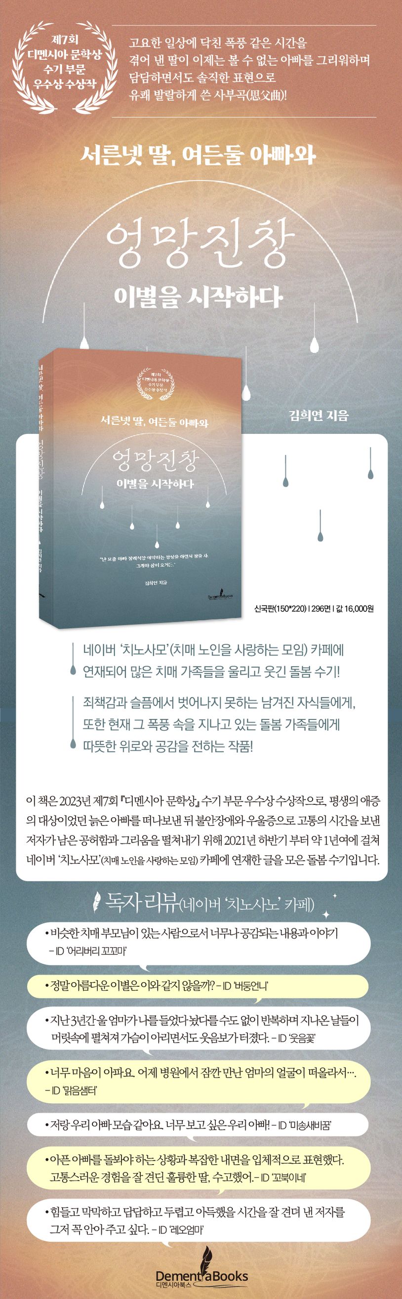『서른넷 딸, 여든둘 아빠와 엉망진창 이별을 시작하다』는 2023년 제7회 『디멘시아 문학상』 수기 부문 우수상 수상작으로, 평생의 애증의 대상이었던 늙은 아빠를 떠나보낸 뒤 불안장애와 우울증으로 고통의 시간을 보낸 저자가 남은 공허함과 그리움을 떨쳐내기 위해 2021년 하반기부터 약 1년여에 걸쳐 네이버 ‘치노사모’(치매노인을 사랑하는 모임) 카페에 연재한 글을 모은 돌봄 수기입니다.
