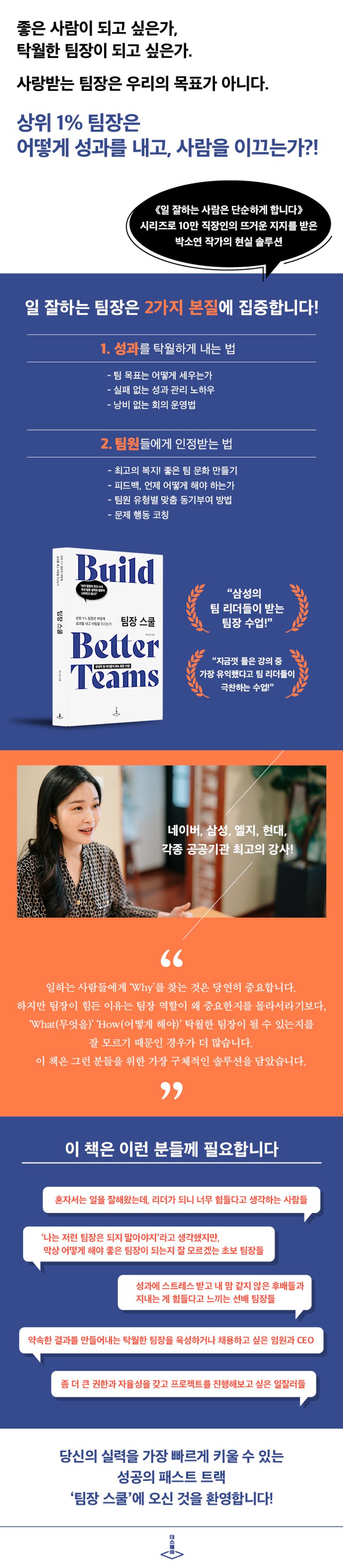 단순한 문장이지만, 일 잘하는 팀장이 가장 집중하는 두 가지 핵심, 즉 ①약속한 성과를 낼 것, ②팀원들의 성장을 이끌 것을 짚고 있다. 이 본질적인 역할을 잘 해낼 수 있는 구체적인 해답을 책에 담았다.