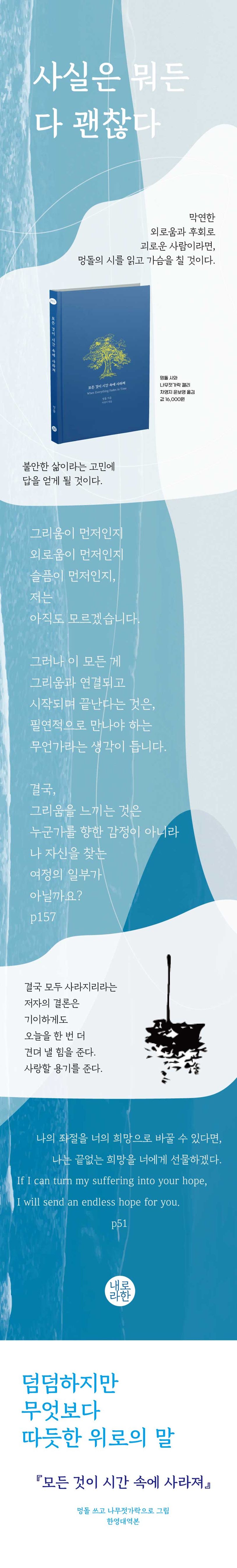 〈〈모든 것이 시간 속에 사라져〉〉는 멍돌의 시 중에서도 깊은 위로를 전하고 잊을 수 있도록 삶의 지혜를 더하는 작품을 골라서 영어로 번역하여 엮은 것이다. 원문과 번역본을 나란히 볼 수 있도록 담아냈다. 부디 멍돌 시인의 노래가 훨훨 날아가 더 많은 이들에게 닿길 바란다.