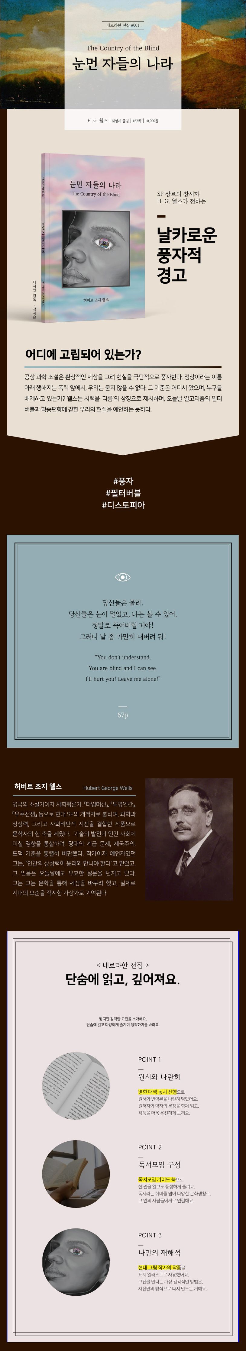 『눈먼 자들의 나라』는 다수의 감각이 곧 ‘진실’이 되는 세계 속에서, 다르게 보는 이의 고립과 침묵, 그리고 ‘정상’이라는 이름의 폭력에 대해 이야기한다. 시각 중심 사회에 던지는 근본적 질문, “무엇이 진짜 보고 있는 것인가?” 술술 읽히는 번역과 더불어 인식, 규범, 다수성의 함정에 대한 성찰을 담은 해설로 작품의 깊이를 더했다.