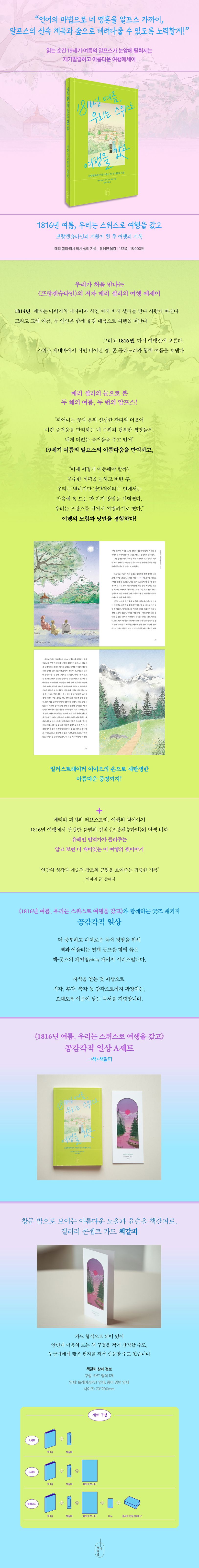 《프랑켄슈타인》을 탄생시킨 천재 작가 메리 셸리의 여행에세이가 국내에 처음으로 소개된다. 《1816년 여름, 우리는 스위스로 여행을 갔고》는 메리가 퍼시 비시 셸리를 처음 만난 1814년, 함께 유럽 대륙으로 떠난 여행과 《프랑켄슈타인》이 탄생한 1816년의 여행을 여행기·서간문·시 등 다양한 형식으로 엮은 기록이다. 여름에 떠난 두 여행의 이야기를 두 천재 작가들의 생생한 서술로 따라가다 보면, 어느새 19세기의 환하고 푸른 알프스로 떠난 기분을 충분히 만끽하게 된다. 이들의 여행을 일러스트레이터 이이오의 손으로 재해석한 아름다운 작품도 본문 내에 수록되어 있어, 여행하는 기분이 시각적으로도 충족될 것이다.
