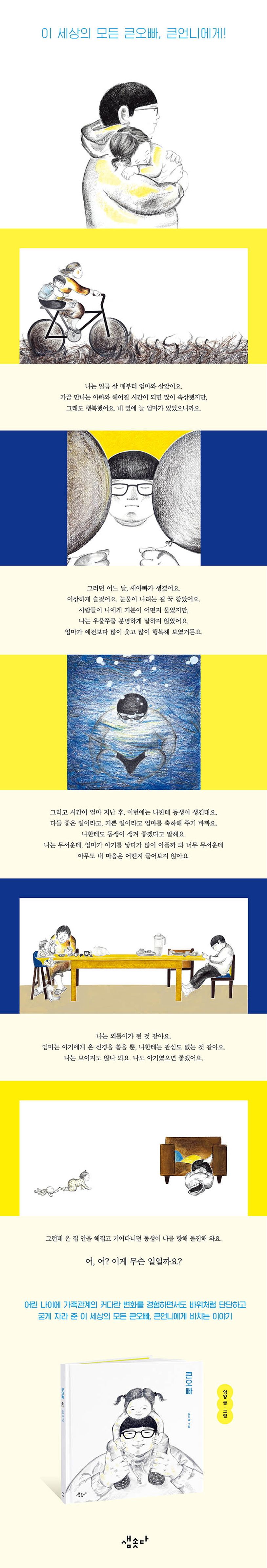 《큰오빠》는 지은이의 자전적 이야기가 담긴 첫 그림책으로, 어린 나이에 가족관계의 커다란 변화를 경험하면서도 바위처럼 단단하고 굳게 자라 준 이 세상의 모든 큰오빠, 큰언니에게 바치는 이야기입니다.