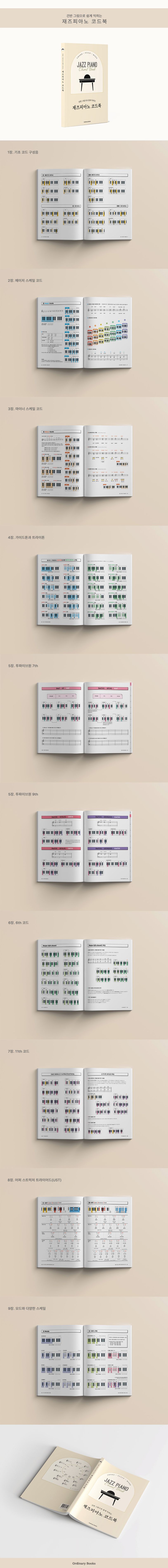 악보를 보는 것이 익숙하지 않은 취미생과 독학러를 위한 재즈피아노 코드북입니다. 건반 그림을 보면서 코드와 스케일을 직관적으로 쉽게 이해할 수 있습니다. 기본 코드 구성음부터 시작하여, 12 Key로 메이저 스케일과 마이너 스케일, 모드까지 잘 정리되었습니다. 오래 걸리는 투파이브원 연습에서는 가이드톤을 구분해서 표시하고, 코드 구성음에 숫자를 표기하여 처음 연습할 때부터 코드의 구성원리를 이해하며 기초를 튼튼하게 코드를 암기할 수 있도록 체계적으로 구성하였습니다. 3화음 보이스리딩부터 시작하여 재즈피아노 어퍼스트럭처 트라이어드 코드의 내용까지 코드에 관한 필수 내용을 담았습니다.