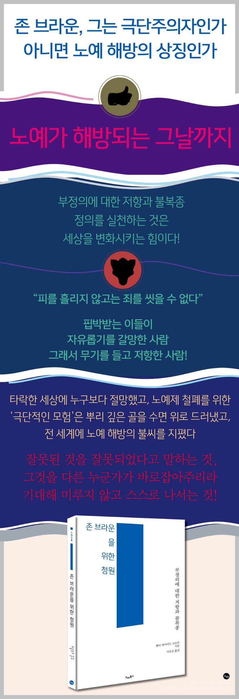 소로우는 우리에게 자연철학자로서 《월든》으로 널리 알려져 있으며 《시민불복종》에서 다루듯 사회와 정부에 대한 개인의 저항 정신을 옹호한 사회운동가였다. 정의를 실천하는 것은 세상을 변화시키는 힘이다. 잘못된 것을 잘못되었다고 말하는 것, 그것을 다른 누군가가 바로잡아주리라 기대해 미루지 않고 스스로 나서는 것. 그것이 소로우가 말한 ‘한 사람으로서의 다수’이며, 존 브라운을 적극 옹호하고 그를 위해 《존 브라운을 위한 청원》을 쓴 의미일 것이다. 부정의에 대한 저항과 불복종을 외친 소로우는 이 책에서 노예 해방 운동의 대명사, 존 브라운의 삶을 뜨겁게 되살려낸다.