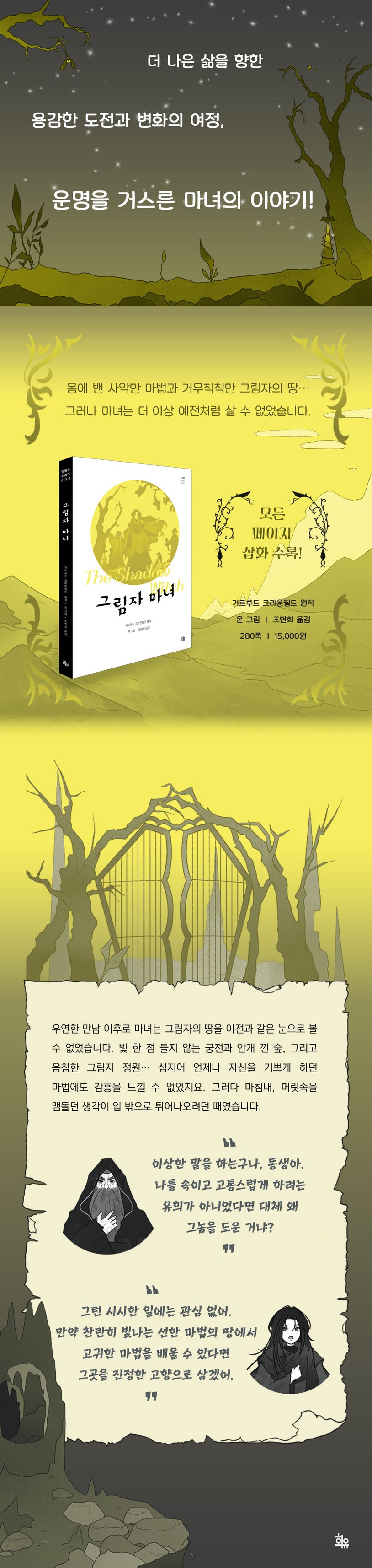 판타지 소설의 선구자, 거트루드 크라운필드의 『그림자 마녀』가 희유 출판사에서 출간되었다. 본 그림책의 이야기는 빛이 닿지 않는 나라에서 태어난 그림자 마녀가 불의 나라에서 온 왕자를 만나며 시작된다. 뜻밖의 만남 후, 마녀는 음침한 땅과 사악한 마법에 얽매인 삶에 회의를 느끼게 된다. 그녀는 행복한 땅과 고상한 마법에 대한 동경을 품지만, 그 마음을 알아챈 잔인한 마법사 오라버니가 그녀를 가두어 버린다.