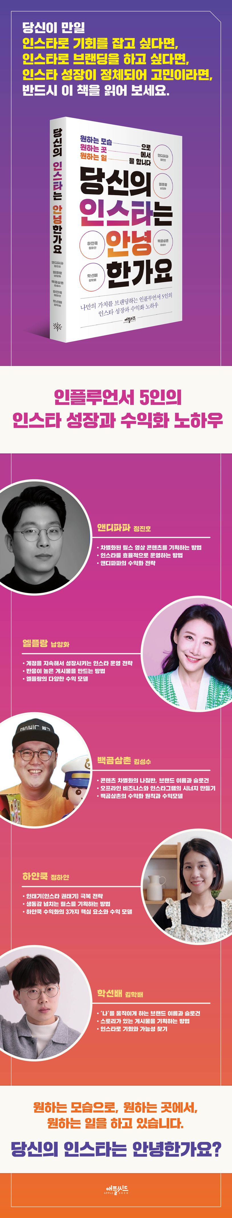 당신은 이 책을 통해서 반응이 높은 콘텐츠를 기획하는 방법부터 인스타를 성장시키는 효과적인 방법, 계정의 주제에 맞게 게시물을 효과적으로 관리하는 방법, 인스타 성장의 정체를 극복하는 방법, 인스타를 통해 수익화를 만드는 다양한 방법 등에 관한 구체적이고 실질적인 노하우와 인사이트를 발견할 것입니다.