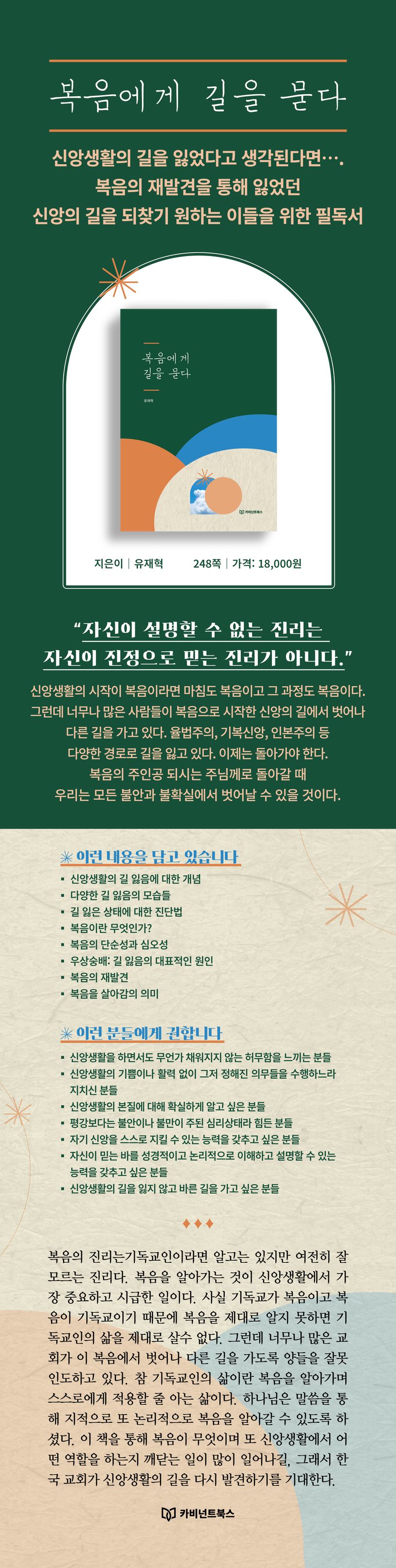 16세기의 종교개혁은 복음을 잃고 오랫동안 영적인 암흑 상태에 시달렸던 교회가 복음의 재발견을 통해 다시 빛으로 나아온 획기적인 사건이었다. 이를 계기로 교회들은 다시 살아났고 참 진리를 발견함으로써 진정한 구원의 회심들이 일어났다. 오늘날 교회에 가장 시급한 일도 종교개혁 당시와 다르지 않다. 바로 복음의 재발견을 통해 영적으로 되살아나는 일이 가장 시급하다. 지금 자신이 바른 신앙의 길을 걷고 있는지 확신이 없다면, 바른 길을 되찾고 싶다면, 이 책이 도움이 될 것이다. 『복음에게 길을 묻다』는 신앙의 자기 점검을 통해 신앙생활의 길을 되찾도록 도와주는 길잡이 같은 책이다. 구체적인 사례들을 통해 독자들은 자신이 공감할 수 있는 방법으로 복음의 길을 분명하게 되찾을 수 있을 것이다.