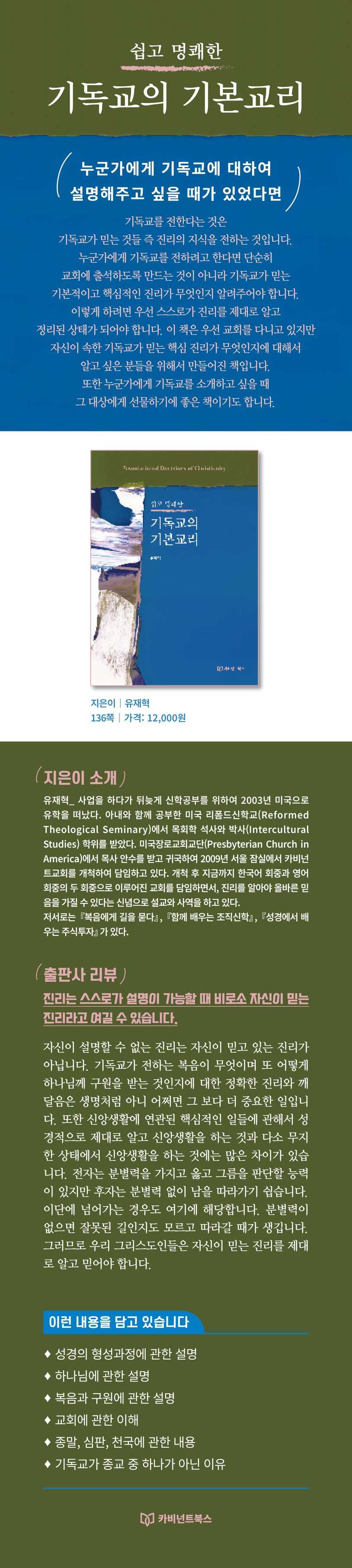 기독교를 전한다는 것은 기독교가 믿는 것들 즉 진리의 지식을 전하는 것입니다. 누군가에게 기독교를 전하려고 한다면 단순히 교회에 출석하도록 만드는 것이 아니라 기독교가 믿는 기본적이고 핵심적인 진리가 무엇인지 알려주어야 합니다. 이렇게 하려면 우선 스스로가 진리를 제대로 알고 정리된 상태가 되어야 합니다. 이 책은 우선 교회를 다니고 있지만 자신이 속한 기독교가 믿는 핵심 진리가 무엇인지에 대해서 알고 싶은 분들을 위해서 만들어진 책입니다. 또한 누군가에게 기독교를 소개하고 싶을 때 그 대상에게 선물하기에 좋은 책이기도 합니다.