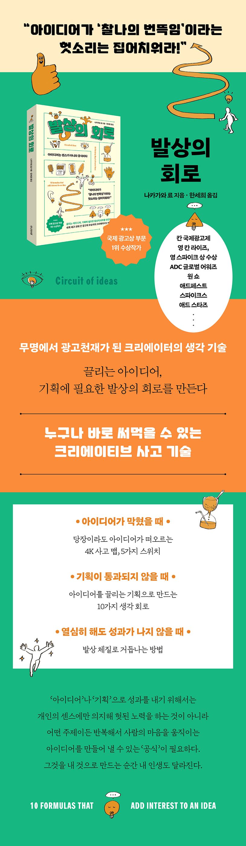 덴쓰는 세계 최대 규모의 일본 광고대행사이다. 이 책의 저자 나카가와 료는 덴쓰의 카피라이터가 되어 자신의 창의성으로 세계 시장을 주름잡고 싶었다. 하지만 막상 입사한 뒤의 현실은 처참했다. 그는 사내 테스트마저 통과하지 못해 영업 부서에서 일해야만 했다. 그는 “왜 내가 떠올린 아이디어는 다른 사람들에게 한심해 보일까?”라는 질문의 답을 찾으려 무려 7년 동안 씨름했다. 인정받는 발상력을 기르고자 관련된 책이라면 모조리 찾아 읽고 고민했다. 어떻게 하면 사람의 마음을 움직이는 기획을 만들 수 있을지 연구하고 시험했다. 그리고 마침내 하나의 생각 회로, 창의력 공식을 완성했다.