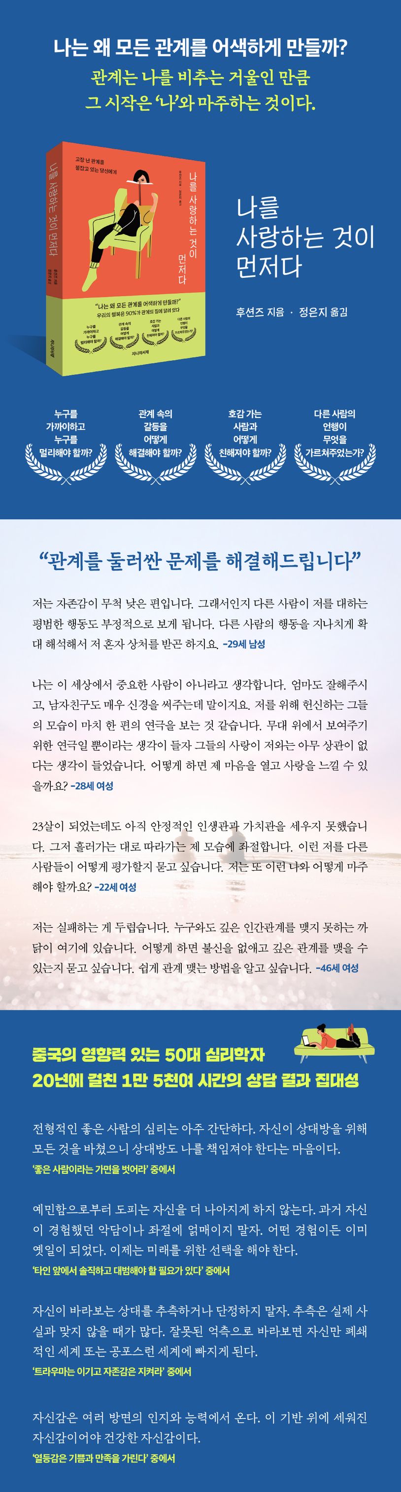 이 책의 저자 후션즈는 대인관계와 관련된 인간의 심리를 20여 년 이상 연구하여 중국에서 가장 영향력 있는 50대 심리학자로 선정됐다. 방송과 교육계를 넘나들며 활발한 활동을 하고 있고 여러 권의 심리학 서적을 펴낸 베스트셀러 작가이기도 하다. 그는 이론에만 그치는 학자가 아니라 실제 베테랑 심리학 멘토로서 인간관계에 관한 어려움을 토로하는 많은 상담자를 만나 총 1만 5천여 시간이 넘는 카운슬링을 했다. 탄탄한 학문적 이론과 소위 ‘1만 시간의 법칙’을 훌쩍 넘어선 실제 상담 경험을 함께 갖춘 멘토로서 그 깊이를 이 책에서 유감없이 발휘했다.