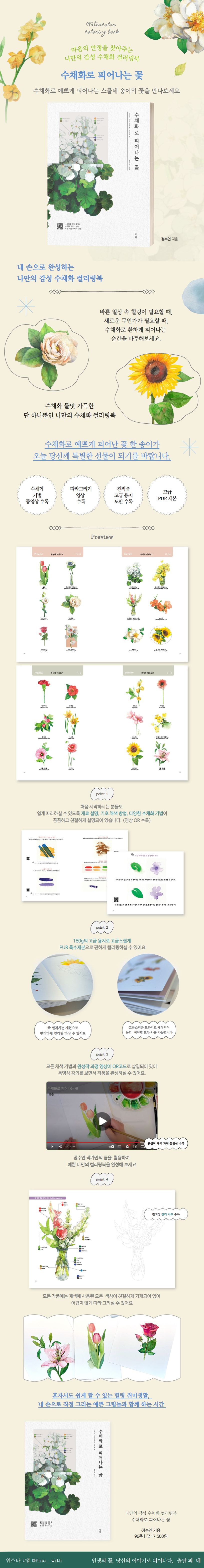 정수연 작가의 첫 번째 책 〈수채화로 피어나는 꽃〉은 감성 수채화 컬러링 북으로 그림을 처음 시작하시는 분들도 쉽게 도전하실 수 있도록 구성되어 있습니다. 수채화에 대한 기초부터 재료 소개, 다양한 채색 기법, 그리고 컬러링 도안까지 담겨 있으니 수채화를 사랑하시는 분들은 자신 있게 도전해 보시기를 바랍니다.