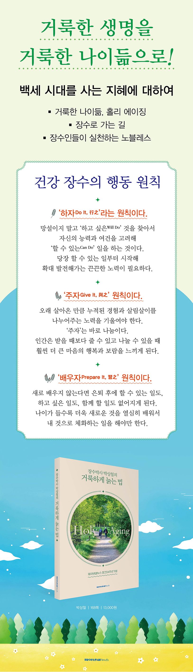 그렇다. 생명이란 거룩한 것이고 따라서 늙음도 거룩한 노정이 아닐 수 없다. 장수시대가 도래하면서 중요한 것은 자신의 건강과 삶의 질을 생의 최종순간까지 어떻게 유지하느냐다. 누구나 염원하는 바는 자신과 주변을 괴롭히지 않고 당당하게 살다가 죽는 것이다. 이것이 거룩하게 늙는 첫 단추다.
