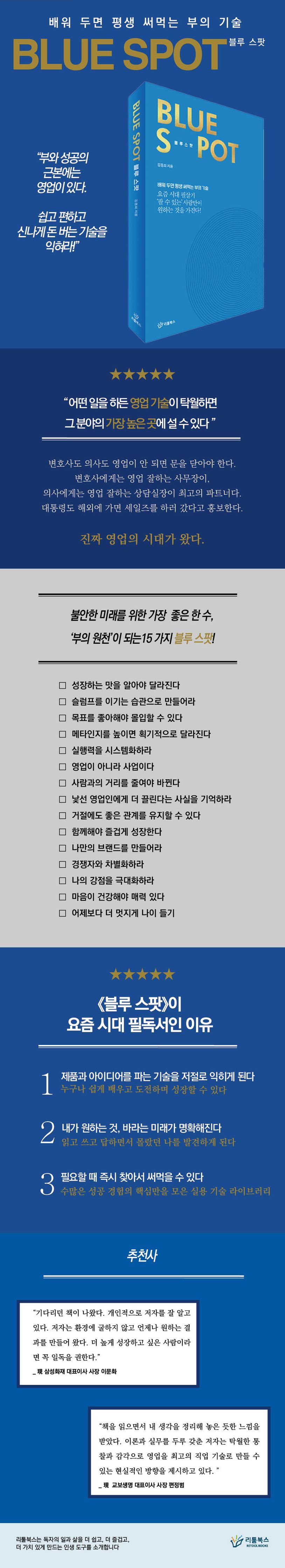 《블루 스팟》은 저자가 30년간 현장에서 경험하고, 10년 이상 세일즈맨을 대상으로 강의한 내용의 핵심만을 정리한 것으로 반드시 배워야 할 영업 기술 15가지로 구성되어 있다. 《블루 스팟》은 미래를 걱정하는 사람에게, 무엇을 어떻게 팔아야 할까에 대해 진지하게 고민하는 사람에게, 영업을 어디서부터 접근해야 하는지 알지 못하는 사람들에게 그 해답을 제시한다. 이제부터라도 부와 성공을 위한 진짜 기술을 배워볼 때이다.