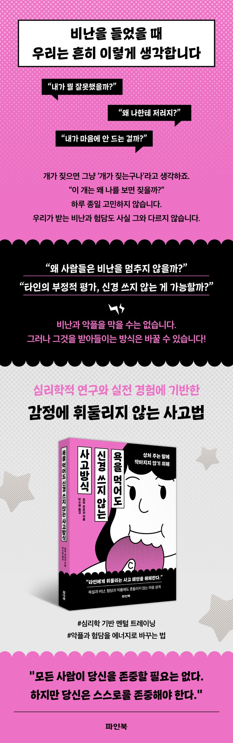 비난을마주했을때우리는무너지는대신,새로운관점을취할수있다.욕을한다는것은상대방이감정을조절하지못한다는뜻이기도하다.즉,그것은‘그사람의문제’이지‘나의문제’가아니다.악플을다는사람은그자체로자신이불행하다는신호를보내는것이다.남의평가에따라나의가치를결정하는것이아니라,스스로나의가치를정하는연습이필요하다.그리고무엇보다비난을성장의에너지로바꾸는방법을익혀야한다.