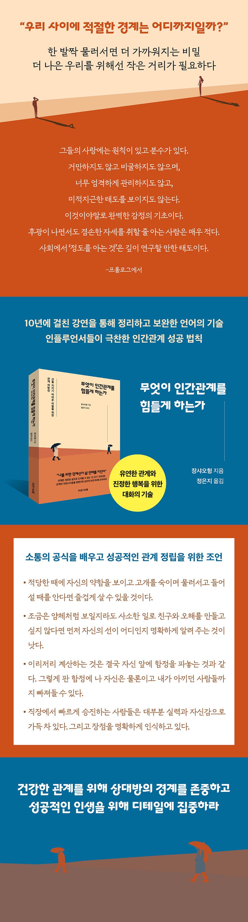 살면서 종종 주변인들과의 관계 형성에 어려움을 느낀 적이 있을 것이다. 그다지 친하지 않은 상태에서 속 깊은 이야기를 들을 때, 오래된 연인으로부터 명령조로 무리한 요구를 받았을 때, 의견이 맞지 않는 동료와 날카롭게 대립할 때, 이러한 불편한 상황들에 맞서 현명하게 대처하지 못한다면 관계는 악화되어 돌이킬 수 없을지도 모른다. 인간관계에 있어서 발생하는 대다수의 문제는 ‘적정선’으로부터 시작된다. 갈등을 예방하고 건강한 관계를 유지 및 지속하기 위해서는 상대방의 경계를 존중하고, 알맞은 거리를 유지하는 것이 중요하다.