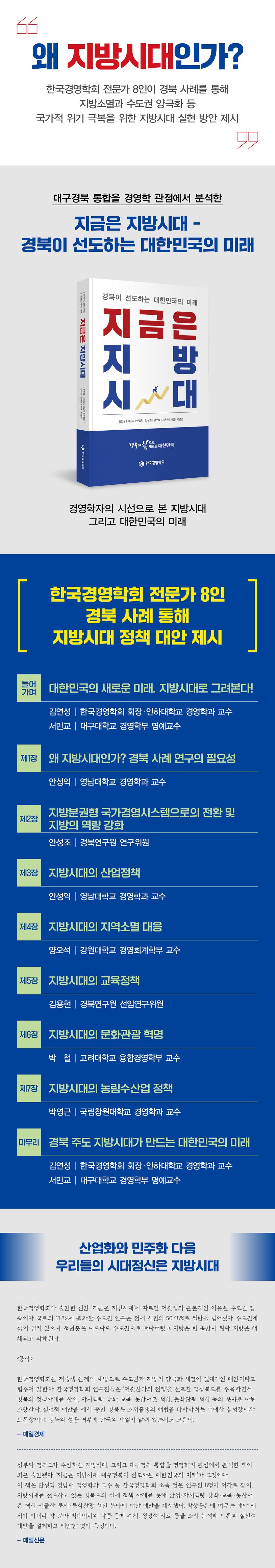 한국경영학회 최고의 전문 연구진 8명이 지방시대를 선도하고 있는 경북의 실제 정책사례를 통해 산업·자치역량 강화·교육·농산어촌 혁신·저출산 문제·문화관광 혁신 등 다양한 분야로 나누어 정책대안을 제시하고 있다. 특히 탁상공론에 머무는 대안 제시가 아니라 각 분야 빅데이터와 각종 통계수치 그리고 정성적 자료 등을 조사, 분석해 이론적·실천적 대안을 설계, 제안하는데 많은 노력을 기울였다.