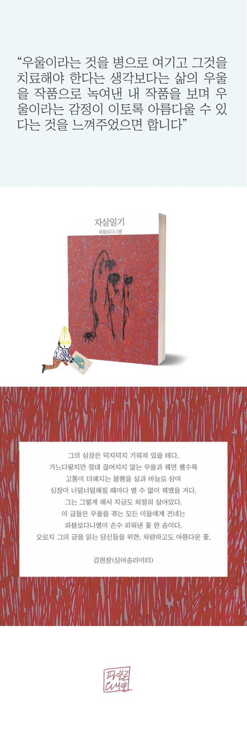시인.시집으로는『자살일기』시리즈『우리가잃어버린크리스마스』『인간지옥』『내사랑을죽여주세요』『우리는불행마저닮아가』『모두가추락하는밤입니다』이있고,에세이『우리죽을각오로사랑할까요?』『레몬인지오렌지인지묻지말아줘』『내게살아가라는말대신사랑한다고말해주세요』가있다.책에등장하는모든그림은직접그리는그림이며,고양이와함께머물며글을쓴다.