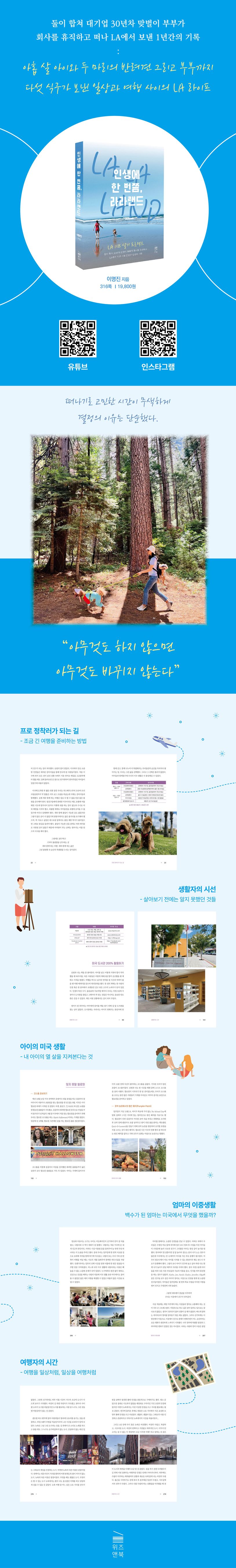 누구나 그렇듯 사람들은 기회가 된다면 언젠가 외국에서 살아 보기를 꿈꾼다. 해외 여행을 떠날 때마다 입버릇처럼 ‘여기에 살면 어떨까?’, ‘어디에서 제일 살아보고 싶어?’와 같은 이야기들을 나누곤 한다. 이처럼 여기 맞벌이 부부의 버킷리스트를 위해 여행자가 아닌 생활자로 아홉 살 아이와 두 마리의 반려견 그리고 부부까지 다섯 식구가 1년 동안 미국 LA에서 보낸 일상과 여행 사이의 소소한 이야기들이 펼쳐진다.