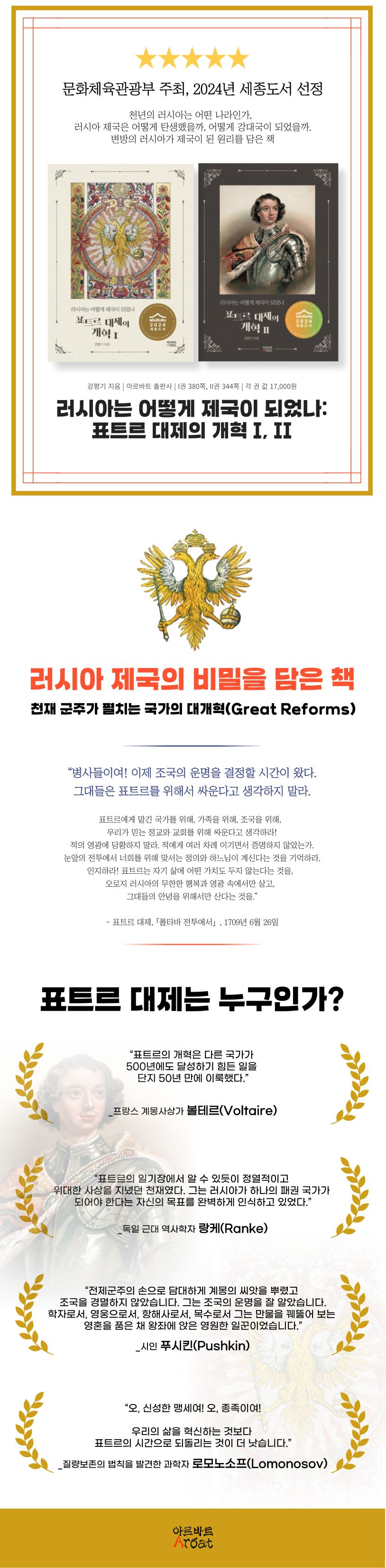 독자들이여! 표트르 대제를 안다는 것, 그의 국가 대개혁을 안다는 것, 그것만으로도 러시아를 이해하는 큰 눈을 가지는 것이다. 유럽으로 향하는 창이 아닌 러시아를 깊숙이 바라보는 내면의 눈이다.