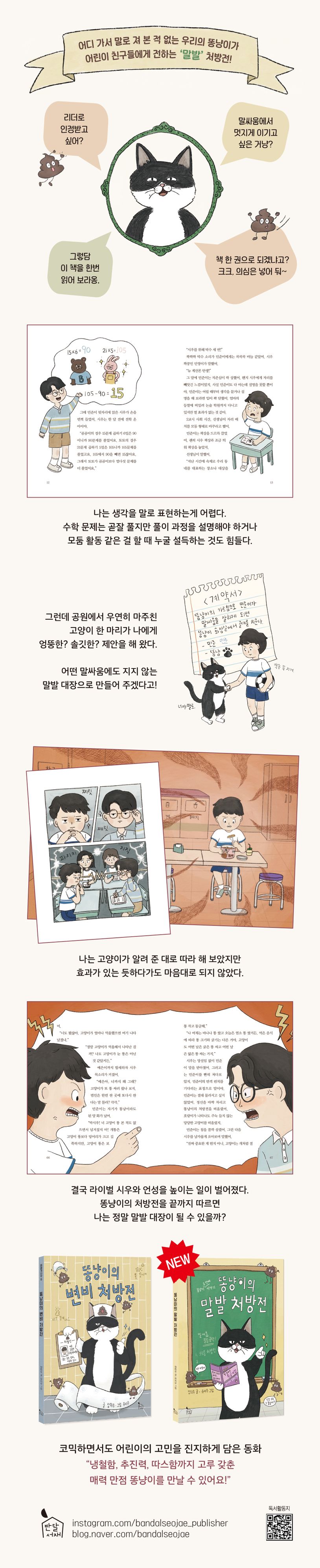 그러던 차에 우연히 당돌한 고양이와 마주치는데…. 민준이가 축구 연습하는 자리를 자기 똥터라고 주장하는 녀석! 아주 얄밉긴 한데 조목조목 따지는 모양새를 보니 말발이 보통이 아니다. 결국 민준이는 이 고양이로부터 말발을 전수받기로 계약을 맺는다. 고양이 덕분에 말싸움을 잘하게 되면 민준이가 축구 연습하는 자리를 고양이의 화장실로 내주는 조건이었다. 학교에서 있었던 일을 털어놓자 가만히 듣던 고양이가 민준이에게 알맞은 처방전을 제시했다. 첫 번째 처방전은 제법 그럴싸하게 들렸고, 다음 날 학교에서 고양이의 가르침대로 따라 하니까 과연 효과가 있었다. 하지만 곧 또 다른 문제에 부딪치고, 시우의 말솜씨에 기가 눌리고 만다. 민준이가 지금 실력으로 친구들을 설득하기에는 역부족인 것 같은데… 앞으로 똥냥이의 말발 처방전이 민준이에게 특효약이 되어 줄지 몹시 궁금해진다.