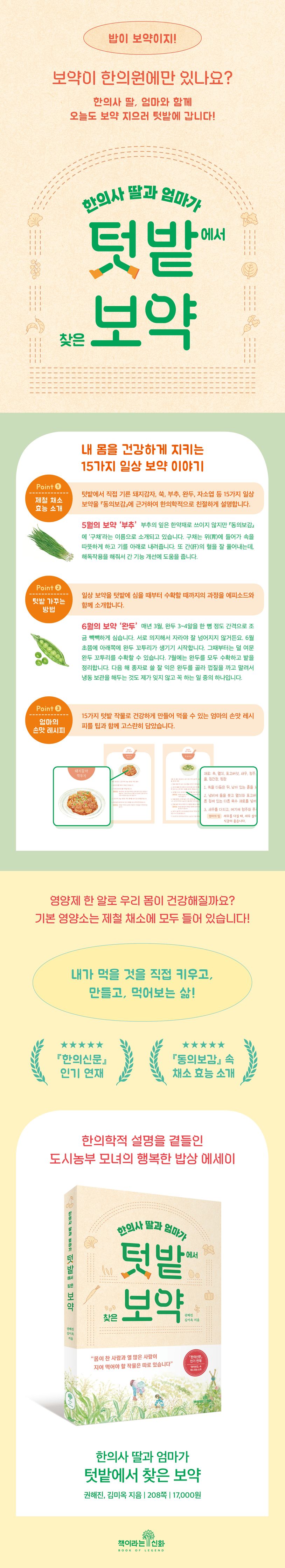 저자 권해진(한의사 딸, 전 파주환경운동연합 공동의장)은 이 문제에 대해 늘 고민하면서 자연과 어우러져 잘 사는 법에 대해 강구했고, 그 하나의 방법으로 ‘내가 먹을 것을 직접 지어서 먹는 것’을 엄마와 함께 생활화하고 있다. 그렇게 도시농부로 산 지 10년째, 권해진과 김미옥(엄마)은 텃밭에서 지은 제철 채소를 먹으면서 밥이 보약이라는 가치를 믿으며 텃밭으로 향하는 일이야말로 건강한 삶을 살 수 있는 근본이 된다는 사실을 알게 되었다. 그리고 이러한 삶을 사람들에게 나누고자 『한의신문』에 연재했다. 인기리에 연재된 글은 블로그와 입소문을 탔고, 내 몸에 어떤 작물이 필요한지, 텃밭에 어떤 작물을 어떻게 키워서 먹는지 알고 싶어 하는 많은 사람의 응원에 힘입어 마침내 단행본으로 출간되었다.